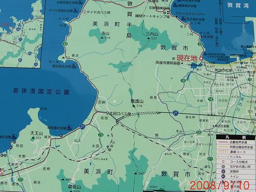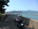 今日の目的の一つでもある小浜市から海を見下ろす快適ロード(有料)を走行。三方五湖に到着。この湖は淡水と海水が混じり五色に変化するらしい。その場所で置き竿で釣りをしている人を見かけ声をかたら、ボラとかセイゴを狙っているとか・・・そんな話を聞いて私も竿を出そうと取り出すとリールのハンドルが走行中にどこかに飛んでいってなくなっている。先ほど道の駅で竿を出したときにツーリングバックに縛り付けたのが悪かったみたいだ。仕方がないので次の目的地に向って走行することにした。三方五湖レインボーライン(有料)で湖を一周。有料のわりにさほど景色が良いとは思わなかった。