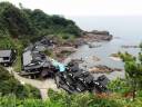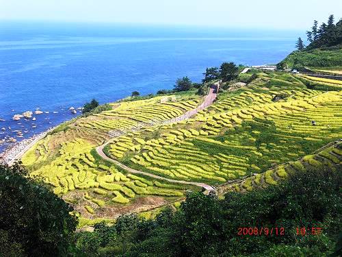 中には鑑定団が評価した3億円の品もあった。 朝市駐車場前に釣具屋があったので立ち寄った。店の人が言うのには輪島港辺りで色んな魚が釣れるとか。早速輪島港に行き30分ほど竿を出した(バイクで2分)。2〜3回小さなアタリがあったが何か分からない? ![]() 輪島港を後にして富山県にと バイクを走らせた。10時55分道の駅「千枚田ポケットパーク」に立ち寄り海に面している国指定名勝の千枚田を見学した。気温25℃ 昔、磯釣りをしていた時のような綺麗な海で、私も竿を出そうと思ったが今日は先が長いので写真撮影だけして次に進んだ。 ![]() ![]()