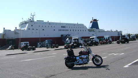 宮崎港に19日(木)朝8時20分に着いた。シーガイアーをバックにお願いして記念撮影を済ます。その後船内からバイクを下ろしカーフェリーをバックに写真を一枚。