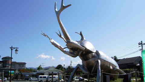 国道220号沿いにの鹿児島県曽於郡にある道の駅あすぱろ大崎で見かけたカカブト虫のオブジェである。材質はステンレス製で可也デカイ。