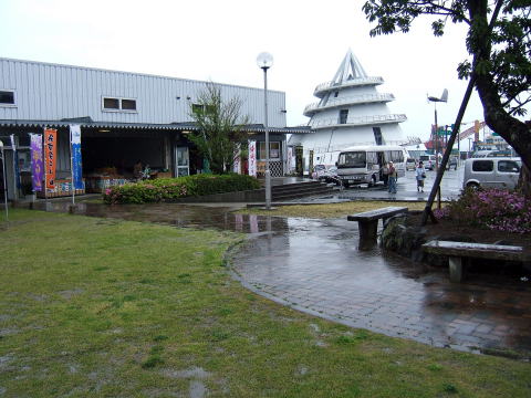 国道3号線から266号線に入り宇城市を通過。上天草市に入る手前に三角港というのがあり地場産の魚介類や農産物の販売をしている。余り雨がひどいので少し立ち寄った。