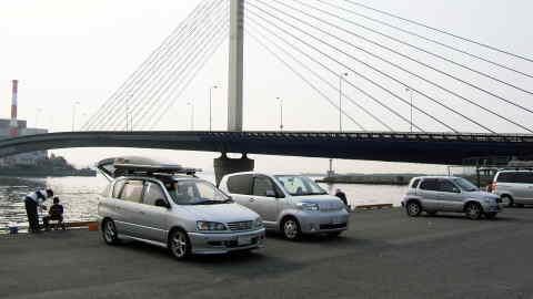 今日を含めて10日間のツーリングを終えかもめ埠頭から帰る途中いつも釣りをしているかもめ大橋の釣り場を覗いてみると何時ものメンバーが魚釣りをしていた。