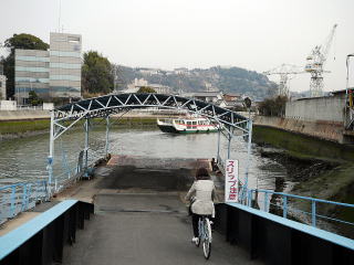 ホテルから渡船まで徒歩で10分。渡船代は片道100円で目的地の向島に渡してくれた。 到着地点の直ぐ前が日立造船向島工場、この造船所の敷地内がロケ地になっていた。 |
