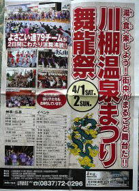 部屋には小さな庭も有り丁度手ごろないい部屋である。大浴場には私の好きな露天風呂もった。 夕食は6時30分に運んでもらった。宿泊費13000円にしては満足のいく料理だった。 仲居さんが料理を運んでくれたとき、川棚温泉の話をしていたら今晩川棚温泉祭りの前夜祭があるという。明日が本番で全国からよさこい79チームが集まり少年相撲や餅まきも有って盛大に行われるとか。 ![]() |