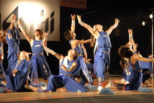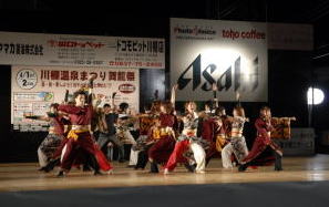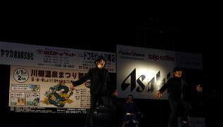私は食事を済ませてぶらっと前夜祭を観に出ることにした。食事が終わりカメラを持って玄関に置いてあった下駄をはき旅館(小天狗)の正面玄関を出ると10メートルも行かない所でステージが設置されており、既にライティングされたステージで前夜祭が行われており、音声を調整するミキサーの方や見物人達で賑わっていた。 私はよさこいを観るのは初めてで、まるで何かに取り付かれたように踊り狂う様子を見て驚いた。 あいにく天気予報では明日は雨、雨の中は走りたくない。撮影を兼ねて明日もう一泊することにした。下関まで来たのだから料理は今日と同じではなくふぐ料理を頼んだ仲居さんが調理場に問い合わせてくれこころよく受けてくれた。 |