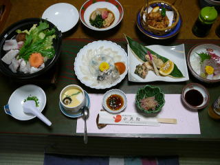 | 川棚温泉二日目は朝から晩までカメラを持ってうろうろ。雨が降れば旅館に戻り部屋を出たり入ったり。残念だったのが少年相撲が雨の為中止!撮影が出来なかった。この川棚温泉まつりは毎年4月1〜2日開催されているようだ。 5時半ごろフロントで露天風呂に入れるかどうか訊くと一日中何時でも入れるとか、今日はよさこいチームが宿泊しているので早めに入っておいたほうが良いと聞いたので18時ごろ入ることにした。風呂から上がると昨晩頼んでおいたふぐ会席が部屋に運ばれた。下関まで来てふぐを食べずには帰れないと思って特別に頼んだが料理が多すぎて食べ切れなかった。 食後中井さんに翌朝は7時に出発したいと言うと、フロントが7時30分からと云うことなので今夜精算を済ますことにした。朝食は仲居さんが少し早めに来て作ってくれるようなことだったがそれも悪いので今夜食べ切れなかったふぐ飯を食べて出発することにした。 |